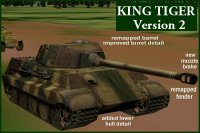 MEGA'S KING TIGER version 2 is here. This modification replaces the default Tiger I with the King Tiger (Tiger II). The user has a choice of installing one of 3 "high resolution-512" versions. Also included with each new skin is a damaged version with open hatches simulating crew escape. Also included is an option to allow you to reinstall the original default Tiger (Tiger I). |