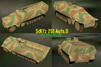 Spudkopf's mod alters the default Janes SdKfz 251 (Ausf A or B) to a SdKfz 251 Ausf.D with interior and un-mirrored skins, there have been many external 3D shape enhancements to try and better capture one of Spudkopf's favourite AFV types as well as some minor 3D interior fittings added. The cam scheme reflects that of a vehicle that has seen continuous action since Normandy, Holland and now the Ardennes, as such it is a well worn tri-color of panzer-yellow, olive- green and red-brown. |
